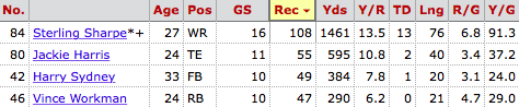 Favre walked into the perfect situation in Green Bay — starting the year throwing passes to Hall-of-Fame receiver Sterling Sharpe. Sharpe and Favre clicked immediately, connecting for 108 catches, 1,461 yards, and 13 touchdowns. Sterling’s 13 touchdowns were more than the Vikings’ top-four receivers combined, and his 6.8 receptions per game almost doubled Greg Jennings’ receptions per game. Behind Sharpe, Favre looked to tight end Jackie Harris, who hauled in 55 catches for 595 yards and two touchdowns. In most offenses, a tight end is a young quarterback’s best friend, and Favre was fortunate enough to connect with Harris early. Favre also benefited from two pass-catching backs, Harry Sydney and Vince Workman, who combined for 98 catches, 674 yards, and one touchdown on the year — the Packers’ west coast system created opportunities for running backs in the short passing game.