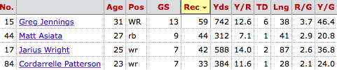 Unlike the Packers in Favre’s first year, Bridgewater’s Vikings lacked a true No. 1 receiver in 2014. Charles Johnson came on late in the year — hence his absence from the list — eventually taking Cordarrelle Patterson’s starting spot on the team. In his second season, Patterson performed well below expectations, hauling in just 33 catches for 384 yards and one touchdown. He displayed poor route running and lacked the physicality he usually displays WITH the ball in his hands.