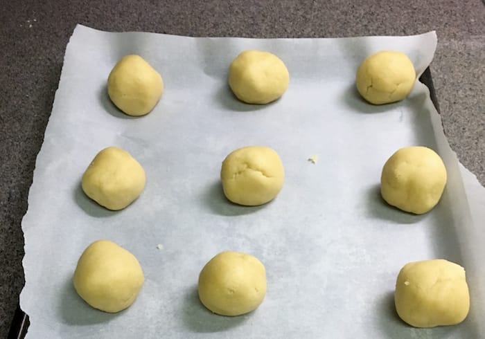 - Scoop the dough and shape the dough into a ball. Once you place the ball onto the baking sheet, lightly flatten it down into a circular shape;