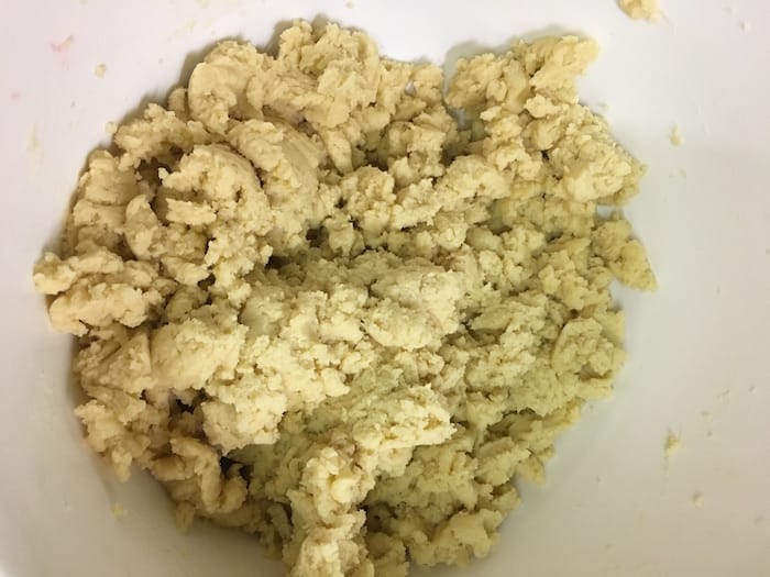- Add the egg, egg yolk, vanilla, and almond extract to the bowl and mix until the eggs are mixed in. Do not over mix at this point;