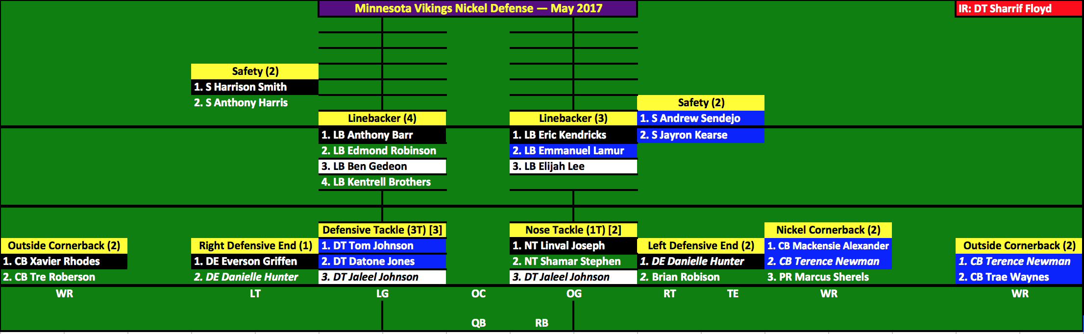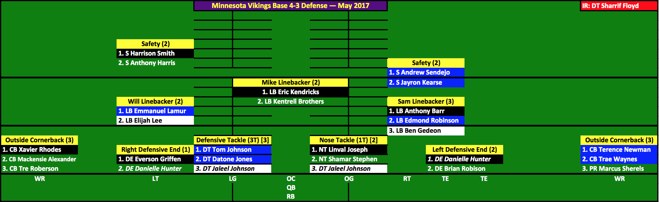Defensive Tackle – 3T (3): Tom Johnson — Datone Jones — Jaleel Johnson — Sharrif Floyd (IR)