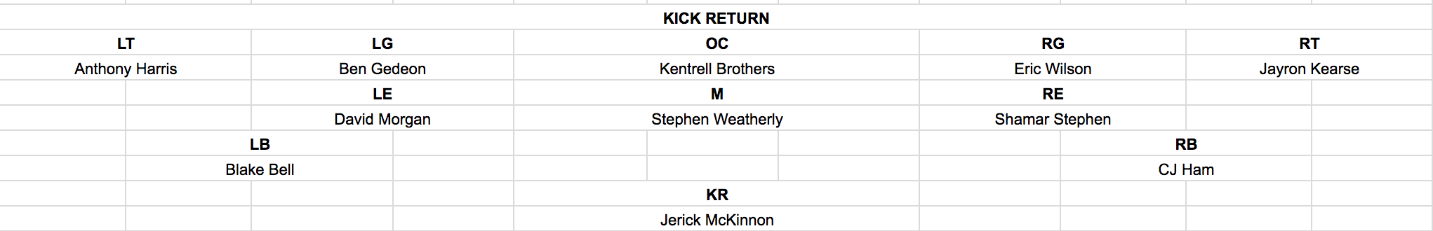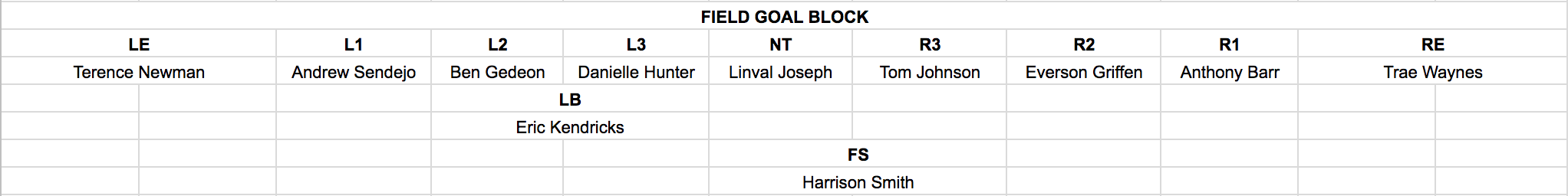 Note: Minnesota has not had to employ its “Hands Team” unit yet this season. Players listed above represent likely candidates based on size, athleticism and “soft hands” relative to assigned position. Purely Speculative.