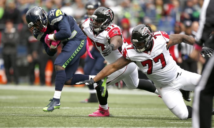 SEATTLE, WA – OCTOBER 16: Running back Christine Michael #32 of the Seattle Seahawks rushes against defensive tackle Grady Jarrett #97 and defensive tackle Ra’Shede Hageman #77 of the the Atlanta Falcons at CenturyLink Field on October 16, 2016 in Seattle, Washington. (Photo by Otto Greule Jr/Getty Images)
