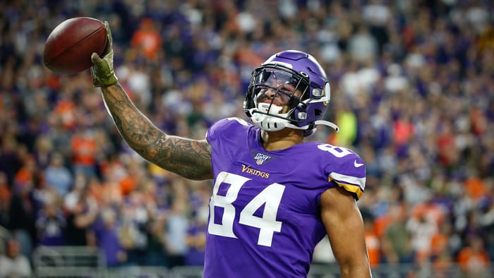 Minnesota Vikings tight end Irv Smith (84) celebrates after catching a 10-yard touchdown pass during the second half of an NFL football game against the Denver Broncos, Sunday, Nov. 17, 2019, in Minneapolis. (AP Photo/Bruce Kluckhohn)