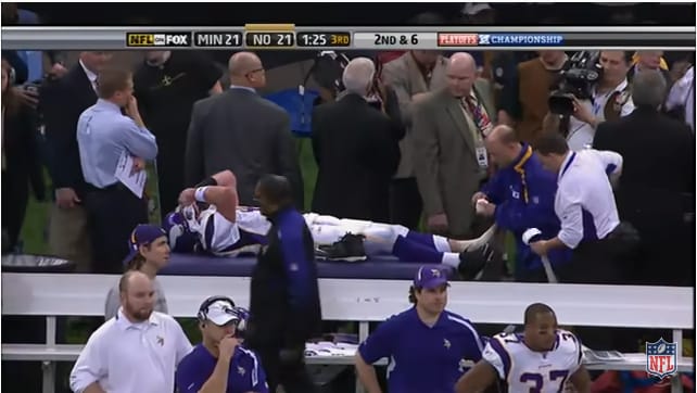 It’s almost heart breaking to see him limp back to the sidelines (while also noting how close another Saint was to hitting Favre, helmet first, while he attempted to recover Harvin’s fumble).