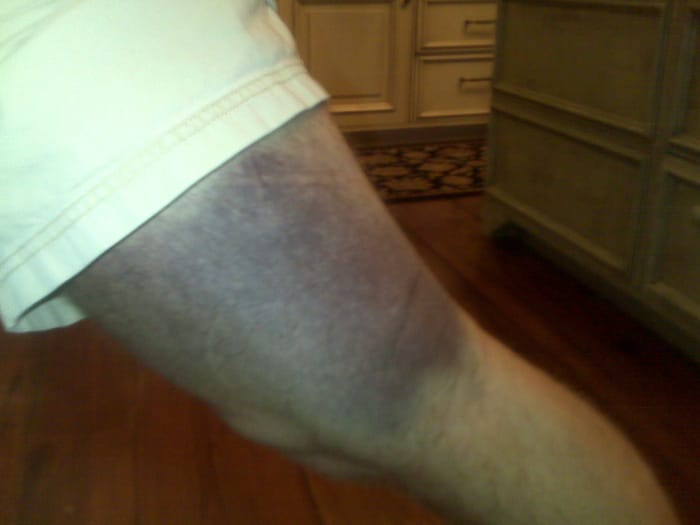 This is not the first injury, as Favre came into the game with a torso that was partially colored the same as his teams away jersey, from a hit in the Cowboys game. The first late hits in the game exacerbated this injury and this hit clearly created a new injury to his lower body. Also, if you see Favre showing signs of physical pain like THIS… You know it has to be pretty bad (and as we found out later, it was, per these photos from MONTHS after the NFCCG):