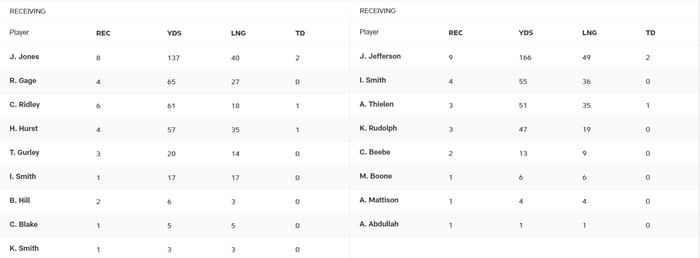 Cousins’ second pick came after another attempted pass to Justin Jefferson, this time AJ Terrell, which lead to Matt Ryan hitting Calvin Ridley (who I just traded for Dalvin Cook (along with Joe Mixon)). Gladney was slowed down by the fact that he had to move through traffic to follow Ridley as he motioned pre-snap, which allowed enough space for Ryan to hit Ridley on a crossing route for a touchdown. Then Cousins threw another interception which led the Fox color commentator to exclaim “You cannot start a first-half of football as poorly as the Vikings have started this game”. He wasn’t wrong.
