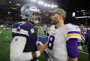 ARLINGTON, TEXAS – NOVEMBER 10: Dak Prescott #4 of the Dallas Cowboys shakes hands with Kirk Cousins #8 of the Minnesota Vikings after the game at AT&T Stadium on November 10, 2019 in Arlington, Texas. (Photo by Richard Rodriguez/Getty Images)