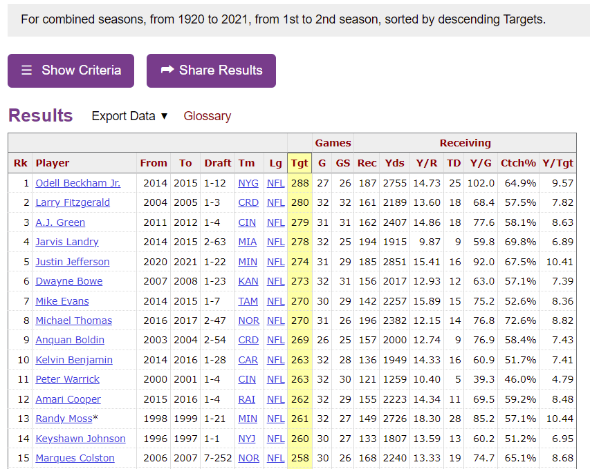 Why? Because Jefferson is on the cusp of accruing more targets in an offense during a player’s first two seasons in NFL history (or at least since the statistic of targets began tracking in 1992).