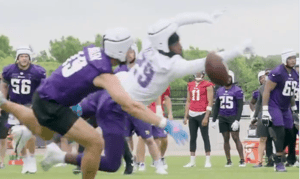 Look in the background at :24 add that together with a snippet at :50, we can see Christian Darrisaw (#71) on the sidelines at the :27 mark and then use your powers of deduction to note that Brian O’Neill is your starter at RG and BOOM…here’s your early OTAs Vikings offensive line.