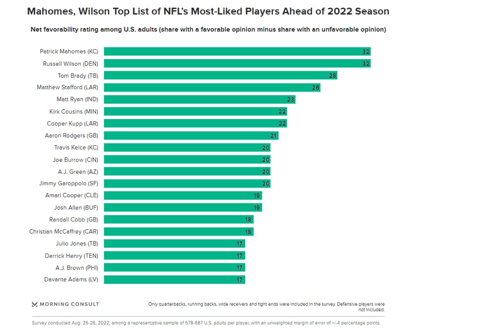 And that’s enough for the general population to hold a favorable opinion of the 34-year-old. Poll responders hold only Patrick Mahomes, Russell Wilson, Tom Brady, Matthew Stafford, and Matt Ryan in higher regard.