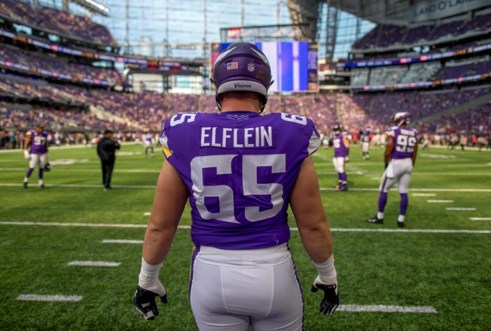 Following his third year, the Vikings moved the former third-round pick to right guard, and he played one game. Because of sustaining a thumb injury in practice, the Vikings waived Elflein, and he moved on to play for the Jets and Panthers.Ā He is under contract with the Panthers for two more seasons.