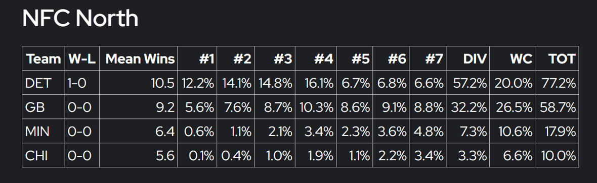 The most unkind of them all, FTNFantasy.com actually predicts Detroit to run away with the NFC North, which would be a first-of-its-kind feat in 30 years. As of late, DVOA stats (now housed at FTN Fantasy) have loathed the Vikings, and 2023 is just a continuation of 2022.
