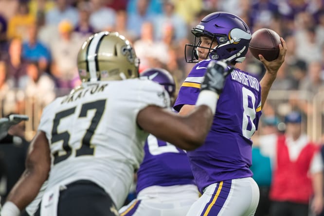 In his second season under center, Bradford had an improved offensive line, but a knee injury kept him out after lighting up the Saints in Week 1 for three scores and a passer rating of 143.0. Case Keenum stepped in and guided the Vikings all the way to the NFC Championship game, including the Minneapolis Miracle. Both players left in the following free agency period, and Kirk Cousins joined the purple team.