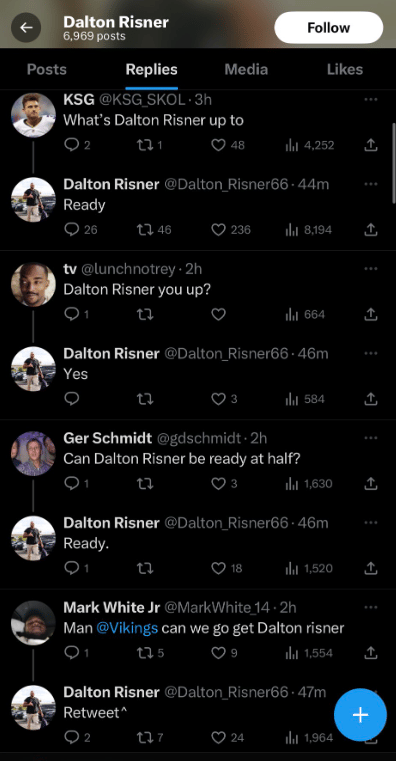The 28-year-old unilaterally responded to Vikings faithful’s requests for a contract signing, seeming to be all-in if his telephone rings. Have a look, and yes, these are from Risner’s X app account: