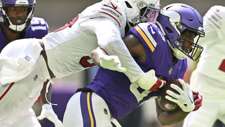 Aug 26, 2023; Minneapolis, Minnesota, USA; Minnesota running back DeWayne McBride (37) is tackled by Arizona Cardinals linebacker Zach McCloud (53) during the third quarter at U.S. Bank Stadium. Mandatory Credit: Jeffrey Becker-USA TODAY Sports