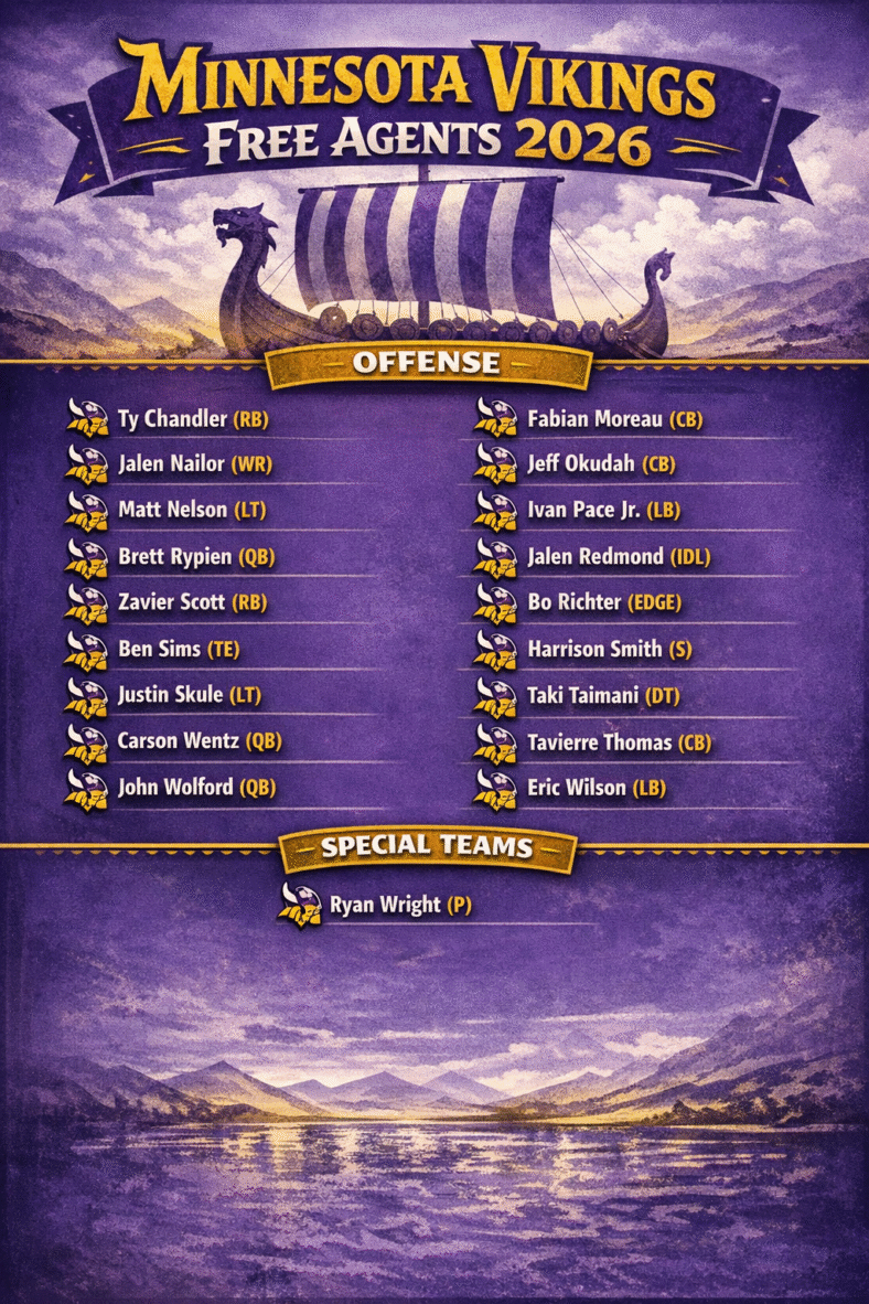 The Minnesota Vikings do not have much spending money for free agency in 2026. Last year at this time, the club had about $70 million to use on external newcomers. This go-round, interim general manager Rob Brzezinski must eliminate about negative $40 million in order to sign anybody at all. But if one assumes that Brzezinski pulls off his usual cap magic, the following list is a “shoot for the stars” collection of free agents.
