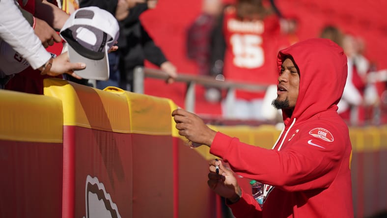 Oct 19, 2025; Kansas City, Missouri, USA; Kansas City Chiefs safety Bryan Cook (6) signs autographs during warmups prior to the game against the Las Vegas Raiders at GEHA Field at Arrowhead Stadium. Mandatory Credit: Denny Medley-Imagn Images